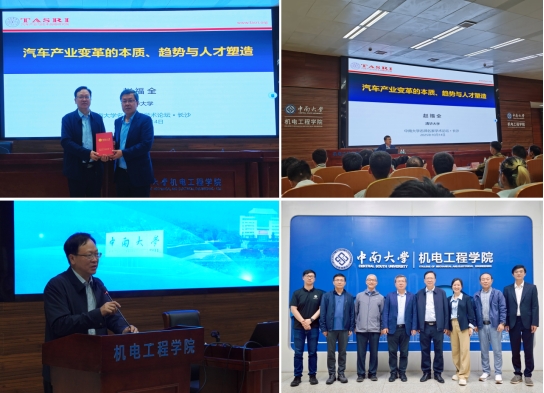 On the evening of October 14, 2025, Professor Fuquan Zhao from the School of Vehicle and Mobility at Tsinghua University, and Dean of Tsinghua Automotive Strategy Research Institute (TASRI), was invited to the "Distinguished Scholars Forum of Central South University". He delivered an academic lecture titled "The Essence, Trends, and Talent Development in the Transformation of the Automotive Industry" to more than 300 teachers and students of Central South University at the Multi-functional Lecture Hall of the College of Mechanical and Electrical Engineering (CMEE). Professor Lairong Xiao, Secretary of the Party Committee of CMEE participated in the event and delivered a speech. Leaders including Lingzhi Li, Zhong Yun and Fenglin Han, as well as all faculty members of the Department of Automotive Engineering, were also in attendance. The report was hosted by Professor Hongwu Ouyang.
