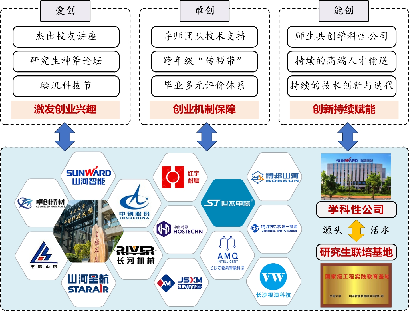 创新提出“师生共创学科性公司”成果转化路径,构建“科研—转化—反哺”价值闭环。学院累计孵化山河智能、中南鸿思、中创空天等学科性公司20余家,其中多家已成为上市公司或国家级专精特新“小巨人”企业。研究生在导师指导下,不仅完成技术突破,更深度参与创业实践,真正实现“创新落地、人才成长、产业反哺”的良性循环。