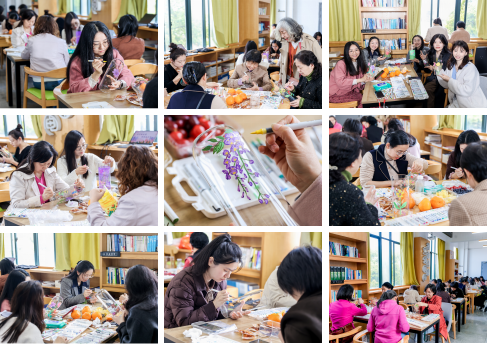 活动上半场在学院“书香中南·文润机电”育人基地展开。作为人文浸润的特色空间,这里书香萦绕、静谧雅致,为创意创作营造了舒适氛围。女职工们手持透明玻璃瓶与缤纷彩笔,或静心勾勒、专注涂抹,或轻声交流、分享灵感。笔尖流转间,花枝舒展、云霞轻漾、春光入画,素净的瓶身渐渐被晕染成明媚春色。