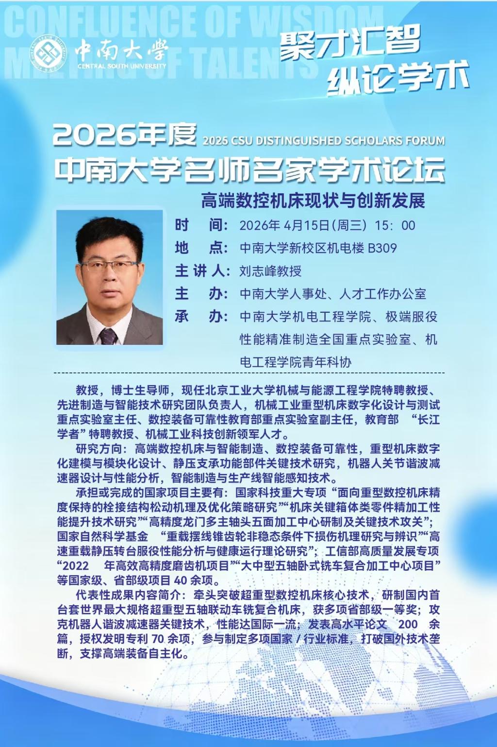 中南大学第六届国际青年学者湘江论坛机械工程分论坛学术报告预告