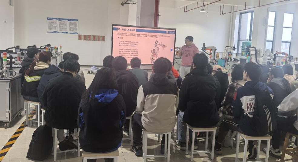 工程实践创新中心开展工业机器人项目集体教研活动发布时间:2026-04-01 浏览次数: 为持续深化实践课程教学改革,全面提升实践教学质量,3月31日下午,韩奉林副院长带领工程实践创新中心听课团队深入工业机器人项目教学一线,开展专项随堂听课与集体教研交流活动。 课堂上,任课教师系统讲授了工业机器人结构原理、发展现状以及设备操作规范等核心内容,并指导学生分组完成上机实操。听课团队全程观摩,细致记录教学设计、教学内容、学生课堂参与及实操技能掌握等关键要素,全面精准地掌握了一线教学的实际成效。